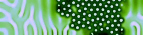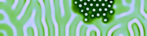A further example of the same category of dynamical systems are the formations of structures in furs of animals where in the same manner so-called "Turing-instabilities" lead to global pattern formations in the total system. Compared with morphogenesis the time scale of the pattern forming processes in the brain is much smaller and, additionally, these processes are only temporarilly stable. The brain is almost always in a transient state. Nevertheless, from a dynamical point of view morphogenetic systems and brains can be regarded as closely releated. The following series of images shows subsequent snapshots of a morphogenetic pattern formation process within a two-dimensional array. One sees that the pattern (so-called "Turing spots") gradually emerges and eventually becomes stationary. At the debut of Liquid Perceptron in the K&S-gallery Berlin, 2 February - 10 March 2001, we also thematized pattern formation in an aesthetic way.