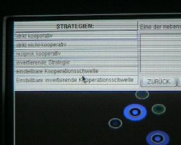 In einem ersten Prototyp, der aufgrund der gesammelten Erfahrung kontinuierlich verbessert werden soll, gibt die Strategie eine relativ simple Verhaltensweise gegenüber anderer Agenten an. Bei einer kooperativen Strategie lässt der Agent bedürftigere Individuen bevorzugt an die Quellen und sichert damit unter Umständen der eigenen Spezies das Überleben, eventuell sogar auf Kosten des eigenen Überlebens, ein mögliches Szenario, das bei einer bunten Mischung an Strategien, die jeweils kontinuierlich einstellbare Parameter haben, analytisch nicht zugänglich ist. Obwohl es im ersten Prototyp nur sechs Strategietypen gibt, ist die Komplexität durch stetig einstellbare Kooperationsgrade dennoch so hoch, dass man laufend Überraschungen erlebt.